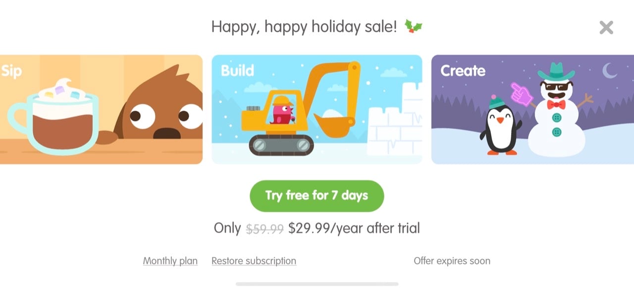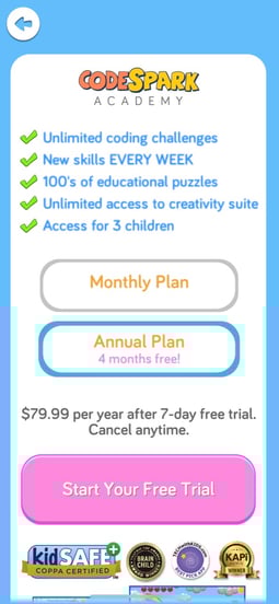 - Discounts for annual sign-up - Offering a hefty discount for an annual subscription is often easy money because kids develop quickly, and they may only stay engaged for a few weeks or months.